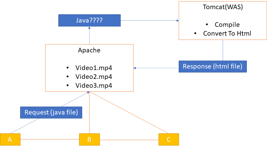 JSP 즉 Java Request가 오면 Web Server는 해당 요청을 이해하지 못하기 때문에 WAS(Tomcat)으로 제어권을 넘긴다. 그러면 WAS에서 해당 파일을 컴파일, 실행하여 결과물을 다시 정적인 데이터로 변경하여 WebServer에게 제공하여 준다.